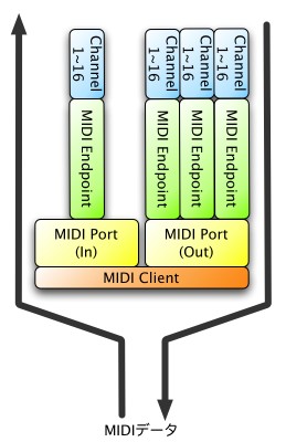 ソースの表示以前のリビジョンバックリンク全て展開する/折り畳む文書の先頭へ Share via Share via... Twitter LinkedIn Facebook Pinterest Telegram WhatsApp Yammer Reddit Teams最近の変更Send via e-Mail印刷パーマリンク × 目次 Core MIDIの基礎 Mac OS XのMIDIアーキテクチャ MIDI Clientの詳細 参考文献 « Core MIDIに手を出してみる MacにgEDAをインストール » Core MIDIの基礎 てれってれー、とCore MIDI/Core Audioの資料とサンプルを見ながら試行錯誤してた所、意外と簡単にSMFプレーヤが出来てしまいました。Core MIDIの日本語資料は殆ど見かけないので、備忘録兼これからCore MIDI触んべよ!という方の手助けになればと、分かった事を記します。 お約束ですが、本記事内容の正確性については保証致し兼ねます(何分、拙い読解力で英文資料を読んでいる為)。また、本記事の内容により生じた損害等の責任は、一切負い兼ねますので悪しからずご了承下さい。間違い等を発見されましたら、容赦なくツッコんで頂けると幸いです。 Mac OS XのMIDIアーキテクチャ 下の図はMac OS XのMIDIアーキテクチャを示したものです。 色々と描いてありますが、ここでは「MIDI Server」と「MIDI Client + アプリケーション」にだけ着目します。 まず「MIDI Server」ですが、その名の通りMac OS XのMIDIサービスを統括・提供するものです。OS X上で扱うMIDIデータは須く、MIDI Serverを通る事になります。システムに接続されているMIDIデバイスの管理の役割も担います。 次に「MIDI Client + アプリケーション」です。アプリケーションは……まぁ説明不要でしょう。MIDI Clientは、アプリケーションがMIDI ServerとMIDIデータのやり取りを行うためのオブジェクトです。逆に言えば、OS XでMIDIを扱うアプリを作ろうとすれば、何らかの形でMIDI Clientのお世話になります。 上の図で、MIDI Clientがアプリ内部にある方は、アプリケーションが明示的にMIDI Clientを生成し利用している様子を、MIdI Clientがアプリの外側にある方は、アプリ内部ではより上位のMIDI APIを利用するなどして直接MIDI Clientを使ってはいないものの、上位APIの下ではMIDI Clientが動いている様子を、それぞれ表しています。 MIDI Clientの詳細 続いてMIDI Client部分の詳細を見て行きます。 それぞれ、下層のオブジェクトが上に載っているオブジェクトを含む、という構造になっています。つまり、Channel 1〜16はMIDI Endpointが持ち、MIDI EndpointはMIDI Portが持ち……という具合です。 MIDI規格では、1本のMIDIケーブルで最大16チャンネル(パート)の情報を伝送出来ますが、このケーブルに当たるのが図中のMIDI Endpointです。ケーブルというよりも、DIN5ピンのMIDI端子の仮想表現と言った方がいいかもしれません。MIDI Endpointは1つに付き16チャンネルのMIDIデータを扱え、プログラム中ではMIDI Endpointをインタフェースとして、MIDIデータのやり取りを行います。 MIDI Endopointは、システムに存在するMIDIポート(MIDI端子という意味でのMIDIポート。後述するMIDI Portとは別物)を割り当てなければなりません。この際、ポートのデータ方向(入力なのか出力なのか)を問わず、自由に割り当てることが出来ます。 MIDI Portは同一データ方向のMIDI Endpointを束ねる役割を持ちます。データ方向毎にMIDI Portを生成し、そこにデータ方向が同じMIDI Endpointを登録します。基本的には、入力用のMIDI Portと出力用のMIDI Portを1つずつ用意し、MIDI Endpointを登録することになります。 ですが、必ずしも入出力両方を用意する必要はなく、入力か出力で最低1つのMIDI PortがあればOKです。また、同一方向のMIDI Portをいくつか生成し、それぞれのMIDI Portに自由にMIDI Endpointを登録しても問題ないようです。1) 1つのMIDI PortはMIDI Endpointをいくつでも持つ事が出来ます。従って上図の構成では、入力として16チャンネル、出力として16 x 3 = 48チャンネル持っている事になります。 MIDI Clientは、MIDI ServerとMIDIデータをやり取りするために、MIDIアプリケーションの土台となるもので、アプリケーション毎に必ず1つは必要です。一応、同一アプリケーション内で2つ以上のMIDI Clientを生成し、それぞれでMIDI Portを作るという事も可能なようです。2) 他にもMIDI Entityという概念があったりしますが、これは存在意義と使い方がよく分からないので、割愛します。資料によれば「MIDI Driverによって定義される、MIDIデバイスの機能の論理的グループ表現」との事なので、挙動はMIDI Driverごとに違うものと思われます。 参考文献 長くなってきたので、以下に参考文献を示して、続きは次回にします。 Core MIDI Framework Reference Core MIDI(MIDI ClientとかMIDI Portとか)のリファレンス。 Audio and MIDI on Mac OS X 微妙にハブられた感のある資料。ファイル名もCoreAudio.pdfとバッティング寸前(CoreAudio.pdfの方はCore Audioメインの解説)。Core MIDIに関する事はこれにしか書いてないので注意。 1) 実験の結果。Appleの資料にはこの辺の記述が見当たらなかったので、正確なところは不明です。まぁ、生成時には識別子を指定するので大丈夫だとは思いますが…。 2) 上に同じ。 Comments ¡Un cordial saludo 