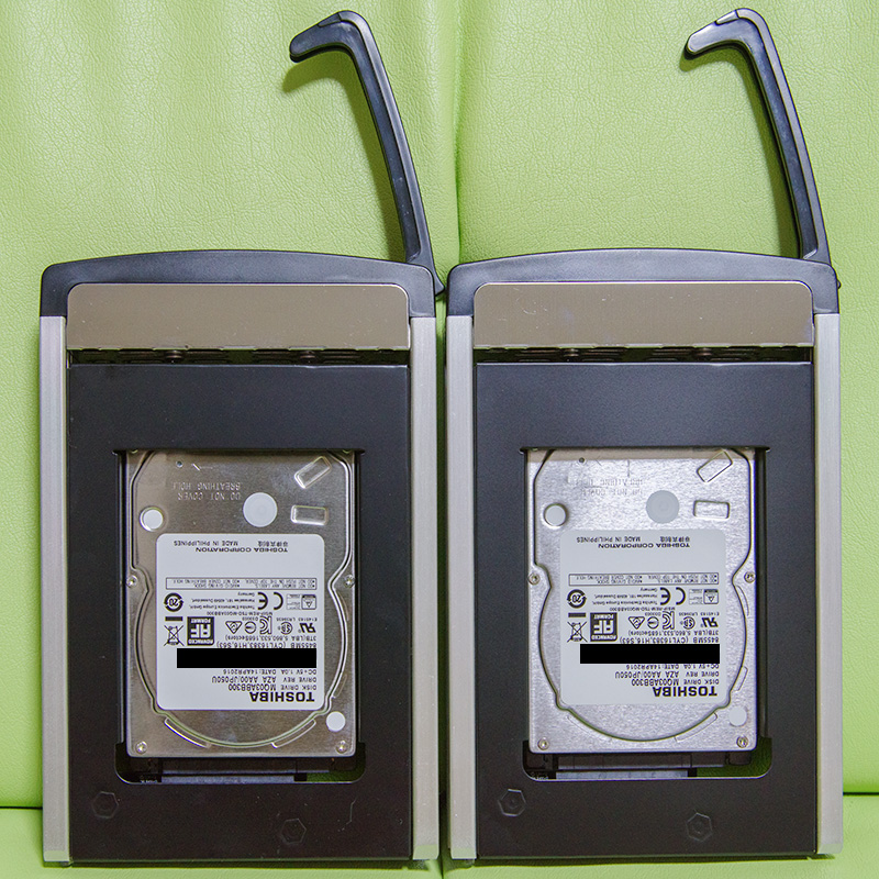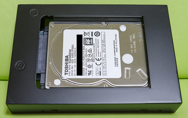 2.5インチSATA HDD/SDDを3.5インチ相当のネジ穴、コネクタ位置に変換するセンチュリーのマウンタCRIN2535は15mm厚の2.5インチHDDでも問題なく使える。公式には12.5mmまでの対応となっているが余裕ではまる。とりあえず、手持ちの15mm厚2.5“ HDD MQ03ABB300を入れてみた之図。