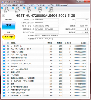 smartmontoolsによるS.M.A.R.T.は↓な感じ。室温26℃、HDDへフルアクセスしてる状態での値である。