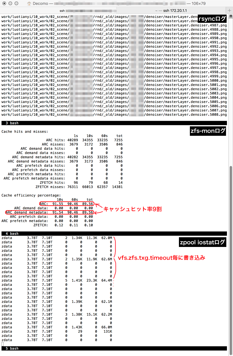 ソースの表示以前のリビジョンバックリンク全て展開する/折り畳む文書の先頭へ Share via Share via... Twitter LinkedIn Facebook Pinterest Telegram WhatsApp Yammer Reddit Teams最近の変更Send via e-Mail印刷パーマリンク × « Intel SSDSC2BB240G4 (DC S3500 240GB) のベンチマーク Samba 4.7.4 on NAS4Free 11.1.0.4がメモリバカ食いする原因がわかった » 今更ながらZFSはキャッシュのヒット率が超重要 この記事には技術的裏付けがない、個人の感想、雑感、推測がふんだんに含まれています。ご利用の際は用法・用量を守り正しくお使いください。 知人のNAS4Freeなファイルサーバが重い問題、Sambaが原因で一件落着かと思いきや解決してなかった。(こっちはこっちで別の問題が発生してたりするので別途書く予定。) 知人とやり取りしつつCPU, ネットワーク, ディスクI/O, その他諸々を継続的にモニタリングしてみると、どーにもディスクアクセスがボトルネックになっている事があるようで…。ファイルサーバのターミナルで直接cpしても、全然速度が上がらないのだ。対象のファイルは、50~200kBの数十万個のPNGを含む膨大なファイル群で、ファイルシステム的に結構厳しい条件ではあるものの、ストレージは仮にもHDD 2ペア×3セットからなるRAID10である。十数MB/sは出るだろうと思ってたが、実際には1MB/s以下になることさえある。 いくらなんでもオカシイだろうとzpool iostatしてみた結果がこちら。 capacity operations bandwidth pool alloc free read write read write ---------- ----- ----- ----- ----- ----- ----- zdata 4.56T 6.31T 5.65K 435 25.5M 4.94M zdata 4.56T 6.31T 7.43K 0 32.7M 0 zdata 4.56T 6.31T 5.44K 0 24.1M 0 zdata 4.56T 6.31T 6.20K 0 27.3M 0 zdata 4.56T 6.31T 6.44K 0 28.4M 0 zdata 4.56T 6.31T 5.81K 398 26.6M 3.89M zdata 4.56T 6.31T 4.36K 215 34.8M 10.8M zdata 4.56T 6.31T 2.76K 391 12.5M 3.47M zdata 4.56T 6.31T 3.58K 0 19.7M 0 zdata 4.56T 6.31T 3.65K 0 20.1M 0 zdata 4.56T 6.31T 3.15K 0 17.7M 0 zdata 4.56T 6.31T 4.05K 0 19.0M 0 zdata 4.56T 6.31T 2.59K 343 14.6M 3.15M zdata 4.56T 6.31T 3.66K 0 19.6M 0 zdata 4.56T 6.31T 4.99K 0 32.5M 0 zdata 4.56T 6.31T 2.93K 0 19.1M 0 zdata 4.56T 6.31T 6.38K 0 28.4M 0 zdata 4.56T 6.31T 3K 344 13.6M 2.99M zdata 4.56T 6.31T 3.86K 0 17.9M 0 zdata 4.56T 6.31T 3.77K 0 16.9M 0 zdata 4.56T 6.31T 3.72K 0 16.8M 0 zdata 4.56T 6.31T 2.91K 226 13.3M 2.39M 読み込み操作数(operations)と読み込み量(bandwidth)の割に、書き込み量が著しく少ない。コピーと並行してSambaへ断続的なアクセスがあるってことを差し引いても全然スループットが出てない。つーか、書き込み量とネットワークに出ていく量を合わせても全然読み込み量に足らん罠。 大量の読み込みoperationsが走ってても、いい感じに処理できてる時は↓こんな感じで順当にbandwidthが上がる。CIFSによるリクエスト分がそのまま処理されてネットワークに流れていっている。 capacity operations bandwidth pool alloc free read write read write ---------- ----- ----- ----- ----- ----- ----- zdata 4.70T 6.17T 15.3K 638 64.8M 7.06M zdata 4.70T 6.17T 23.8K 0 101M 0 zdata 4.70T 6.17T 20.4K 0 85.9M 0 zdata 4.70T 6.17T 23.6K 0 98.7M 0 zdata 4.70T 6.17T 18.4K 0 76.5M 0 zdata 4.70T 6.17T 7.06K 720 30.1M 8.41M zdata 4.70T 6.17T 16.6K 0 70.0M 0 zdata 4.70T 6.17T 13.7K 0 57.7M 0 zdata 4.70T 6.17T 18.1K 0 77.3M 0 zdata 4.70T 6.17T 16.7K 536 72.3M 6.52M zdata 4.70T 6.17T 7.63K 80 32.5M 376K zdata 4.70T 6.17T 12.3K 0 52.7M 0 zdata 4.70T 6.17T 9.78K 0 42.4M 0 zdata 4.70T 6.17T 11.8K 0 51.0M 0 zdata 4.70T 6.17T 9.32K 586 40.4M 6.41M zdata 4.70T 6.17T 9.47K 0 40.6M 0 zdata 4.70T 6.17T 11.6K 0 49.2M 0 zdata 4.70T 6.17T 12.1K 0 51.8M 0 zdata 4.70T 6.17T 5.05K 0 22.2M 0 zdata 4.70T 6.17T 4.88K 579 22.1M 6.61M rsyncでディスク内コピーを行うと更に悲惨で、びっくりするほど速度が出ない。ネットワーク(1000BASE-T)越しの別マシンにzfs sendし、そいつとrsyncで同期した方が早いっていうね…。すわ、断片化か!?と思ったけど、プールは半分以上空いてるしちょっと考えにくい。 あれこれ考えてるうちに、ZFSはキャッシュのヒット率が重要って事を思い出した。1フォルダに大量の細かなファイルがあるって事は、その分メタデータ処理が重いと考えられる。とすれば、メタデータを使いまくってそうなrsyncで速度が出ないってのも説明が付く………気がしなくもない。 zfs-statsを入れてキャッシュのヒット率を見てみたら、なんと2割を切ってるじゃないの。キャッシュに乗り切らなかったメタデータに毎度アクセスしに行くために、read operationsの割にbandwidthが上がらなかったのかしら…? とりあえずarc関連のカーネル変数を調整したところ、いい感じでキャッシュヒットするようになった。問題のプール内のディレクトリ間でrsyncした時の結果が↓これ。 キャッシュヒット率が90%ほどに改善し、書き込みも12MB/s程出ている(zdata iostatは1秒毎、vfs.zfs.txg.timeout=5である)。 Comments see page https://web-jaxxliberty.com 1 | Floydwaync | 2025-08-11 09:17 | reply Resources https://latch.icu 2 | Melvinlem | 2025-08-17 09:55 | reply try this website https://kikifinance.xyz/ 3 | WarrenTrism | 2025-08-18 16:16 | reply Visit Your URL https://iguanadex.cc 4 | TrentNeusA | 2025-08-19 03:12 | reply blog https://aera.ink/ 5 | DanielGAB | 2025-08-19 06:01 | reply my explanation https://zoth.lat 6 | Jamesalicy | 2025-08-19 07:37 | reply Casino Rating Ukraine - провідний незалежний рейтинг