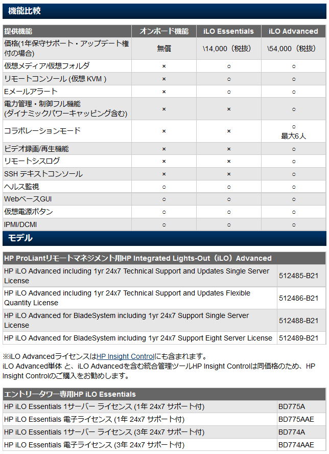 ソースの表示以前のリビジョンバックリンク全て展開する/折り畳む文書の先頭へ Share via Share via... Twitter LinkedIn Facebook Pinterest Telegram WhatsApp Yammer Reddit Teams最近の変更Send via e-Mail印刷パーマリンク × « SambaとZFSで大量のファイルを扱う時はcase-sensitiveを最適化する Windowsの記憶域階層な共有フォルダがプチフリする謎現象 » HPE iLO 4の機能比較表 https://h50146.www5.hpe.com/products/servers/proliant/essentials/ilo4/mo.htmlにiLO 4の分かりやすい機能比較表があったんだけど、リニューアル?でページがなくなってしまったのでスクショをうp。標準機能、iLO Essentials、iLO Advancedの比較表だよん。 気が向いたらStandard込みの表を作るかも…。StandardはPDFを読み解かないといけないのでちょい面倒なのよね。 それにしても、ネット上のHP/HPEへのリンク情報がほとんど使い物にならなくなっててつらたん。草の根情報って結構重要だと思うんだけど、HPEは一体何を考えとるのかね!? Comments Name E-Mail Website 人間の証明として、ボックス内の全ての文字を入力してください。 この項目は空のままにして下さい:Preview Comment blog/2018/2018-07-04.txt 最終更新: 2018-07-04 19:58by Decomo