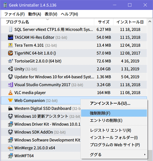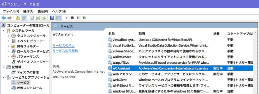 ソースの表示以前のリビジョンバックリンク全て展開する/折り畳む文書の先頭へ Share via Share via... Twitter LinkedIn Facebook Pinterest Telegram WhatsApp Yammer Reddit Teams最近の変更Send via e-Mail印刷パーマリンク × « RAID-Z Expansionのプリアルファ版コードとFreeBSDで使える格安10GbE NIC FreeBSD 11.2-RELEASEをFreeBSD 12.0-RELEASEに更新 » プログラム一覧に載ってない Lavasoft Web Companion を消す いつごろからか、PC起動時に「Another instance is running : 'WebCompanion.UI.AppCore.Services.InstallerService'のタイプ初期化子が例外をスローしました。」というダイアログが出るようになった。 特段気にもしてなかったが、いい加減うざい&何か気持ち悪いので調べてみたところ、Web Companionとかいうアンチアドウェアを騙るアドウェアらしい。ググって出てきた情報を鵜呑みにしてるので間違ってるかもしれないが、自分が能動的に入れた記憶は一切ないのでお行儀の悪いソフトである事は間違いない。 Geek Uninstallerで強制削除すればアンインストールできるそうだが、自分の環境では「プログラムと機能」(アプリと機能)の一覧に出てこなかった。そういえば、結構前にアンインストールボタンを押したような気がしないでもない…。 とりあえず、C:\Program Files (x86)\Lavasoft\Web Companion\Applicationにアンインストーラがないかと覗いてみるも、それっぽいexeはなし。WebCompanionInstaller.exeがアンインストーラも兼ねてるかも?と思い実行してみたけど、やはりアンインストールは出来ず。だがしかし、プログラムと機能にWeb Companionが復活した笑。どうやら再インストール扱いになった模様。 あとはGeek Uninstallerで強制削除を実行。 全部にチェックを入れて「完了」! それでも一部のファイルは残ったままで、消そうとしても「使用中で消せないよーん」と言われる。 コンピュータの管理を開き、サービスメニューから関連サービスと思われる「WC Assistant」を停止して、上記フォルダを手動で削除する。 多分これで完全に消えたはず? 参考サイト 「GeekUninstaller」アプリケーションのアンインストールを支援するソフト - 窓の杜 【ウイルス】Web Companionというソフトが知らない間にパソコンに侵入していましたwwwというわけで削除します。 スパイウェア対策ソフト「Ad-Aware」の使用は慎重に! ( Windows ) - 悪代官の伏魔殿別館ブログ - Yahoo!ブログ Comments Name E-Mail Website 人間の証明として、ボックス内の全ての文字を入力してください。 この項目は空のままにして下さい:Preview Comment blog/2019/2019-05-19.txt 最終更新: 2019-05-19 13:14by Decomo