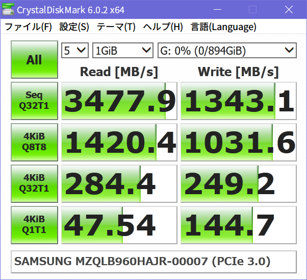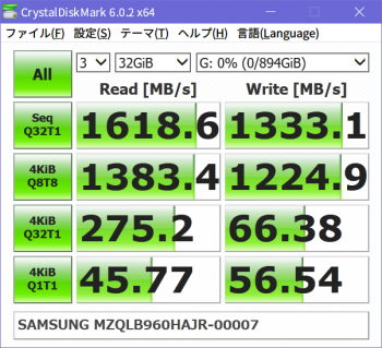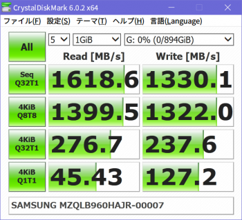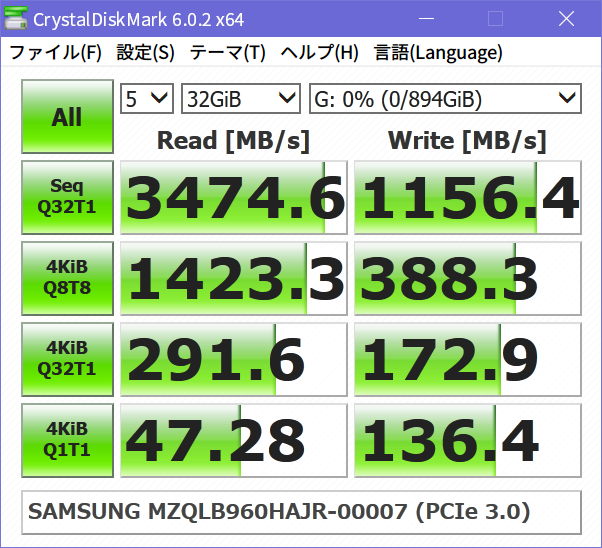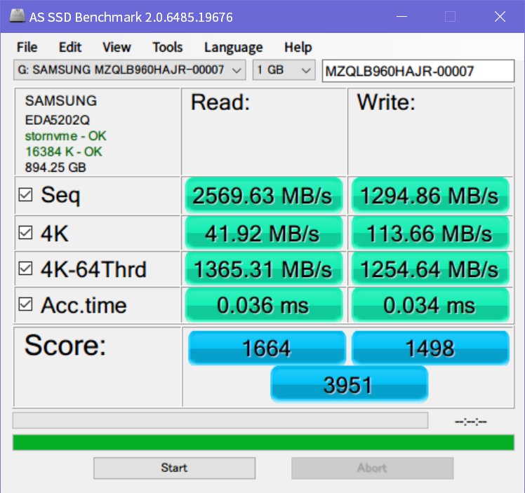 ソースの表示以前のリビジョンバックリンク全て展開する/折り畳む文書の先頭へ Share via Share via... Twitter LinkedIn Facebook Pinterest Telegram WhatsApp Yammer Reddit Teams最近の変更Send via e-Mail印刷パーマリンク × 目次 SAMSUNG PM983 960GBのベンチマーク Crystal Disk Mark 6.0.2 x64 AS SSD Benchmark 2.0.6485.19676 « Windows 10 1903のRDPが固まる問題はWDDMドライバ無効で回避できるっぽい Supermicro X10DRiは普通にNVMeブート対応してるっぽい? » SAMSUNG PM983 960GBのベンチマーク SAMSUNGのエンタープライズ向けSSD、PM983シリーズの960GBモデルMZQLB960HAJR-00007がやってきた。宅内ネットワークの40GbE化により、サーバのストレージがSATAのSSDでは物足りなくなったため、うっかりポチってしまった。 速度的には最近のM.2なSSDの方が速かったりするんだけど、少しくらい遅くてもエンプラ向けの高信頼品が欲しかったのですよ。で、eBay見てたら販売店テスト済みの中古品が1万円弱だったので2台買っちゃった。PM963, PM953あたりなら同価格で新古品がそこそこ出回ってるようだが、中古とはいえPM983が1万円はなかなかのお買い得品。スペックは以下の通り。 シーケンシャル Read 3000MB/s Write 1050MB/s ランダム Read 400000 IOPS Write 40000 IOPS 1.3 DWPD (TBW=1366TB) TLC (3bit MLC VNAND) 9/2に注文して受け取れたのは9/14。届いたモノは、綺麗な外観の書き込み量は1TB弱で、中古としては上々と言える。 Crystal Disk Mark 6.0.2 x64 1GB CrystalDiskMark 6.0.2 x64 (C) 2007-2018 hiyohiyo Sequential Read (Q= 32,T= 1) : 3477.878 MB/s Sequential Write (Q= 32,T= 1) : 1343.090 MB/s Random Read 4KiB (Q= 8,T= 8) : 1420.408 MB/s [ 346779.3 IOPS] Random Write 4KiB (Q= 8,T= 8) : 1031.596 MB/s [ 251854.5 IOPS] Random Read 4KiB (Q= 32,T= 1) : 284.364 MB/s [ 69424.8 IOPS] Random Write 4KiB (Q= 32,T= 1) : 249.212 MB/s [ 60842.8 IOPS] Random Read 4KiB (Q= 1,T= 1) : 47.538 MB/s [ 11606.0 IOPS] Random Write 4KiB (Q= 1,T= 1) : 144.743 MB/s [ 35337.6 IOPS] Test : 1024 MiB [G: 0.0% (0.1/894.2 GiB)] (x5) [Interval=0 sec] Date : 2019/09/15 22:02:39 OS : Windows 10 Professional [10.0 Build 18362] (x64) SAMSUNG MZQLB960HAJR-00007 (PCIe 3.0) 32GB CrystalDiskMark 6.0.2 x64 (C) 2007-2018 hiyohiyo Sequential Read (Q= 32,T= 1) : 3474.642 MB/s Sequential Write (Q= 32,T= 1) : 1156.368 MB/s Random Read 4KiB (Q= 8,T= 8) : 1423.327 MB/s [ 347491.9 IOPS] Random Write 4KiB (Q= 8,T= 8) : 388.278 MB/s [ 94794.4 IOPS] Random Read 4KiB (Q= 32,T= 1) : 291.644 MB/s [ 71202.1 IOPS] Random Write 4KiB (Q= 32,T= 1) : 172.880 MB/s [ 42207.0 IOPS] Random Read 4KiB (Q= 1,T= 1) : 47.276 MB/s [ 11542.0 IOPS] Random Write 4KiB (Q= 1,T= 1) : 136.357 MB/s [ 33290.3 IOPS] Test : 32768 MiB [G: 0.0% (0.1/894.2 GiB)] (x5) [Interval=0 sec] Date : 2019/09/15 22:03:08 OS : Windows 10 Professional [10.0 Build 18362] (x64) SAMSUNG MZQLB960HAJR-00007 (PCIe 3.0) AS SSD Benchmark 2.0.6485.19676 1GB AS SSD Benchmark 2.0.6485.19676 ------------------------------ Name: SAMSUNG MZQLB960HAJR-00007 Firmware: EDA5202Q Controller: stornvme Offset: 16384 K - OK Size: 894.25 GB Date: 2019/09/15 22:03:59 Note: MZQLB960HAJR-00007 ------------------------------ Sequential: ------------------------------ Read: 2569.63 MB/s Write: 1294.86 MB/s ------------------------------ 4K: ------------------------------ Read: 41.92 MB/s Write: 113.66 MB/s ------------------------------ 4K-64Threads: ------------------------------ Read: 1365.31 MB/s Write: 1254.64 MB/s ------------------------------ Access Times: ------------------------------ Read: 0.036 ms Write: 0.034 ms ------------------------------ Score: ------------------------------ Read: 1664 Write: 1498 Total: 3951 ------------------------------ AS SSD Benchmark 2.0.6485.19676 ------------------------------ Name: SAMSUNG MZQLB960HAJR-00007 Firmware: EDA5202Q Controller: stornvme Offset: 16384 K - OK Size: 894.25 GB Date: 2019/09/15 22:04:22 Note: MZQLB960HAJR-00007 ------------------------------ 16MB ------------------------------ Read: 160.60 iops Write: 80.93 iops ------------------------------ 4K: ------------------------------ Read: 10731 iops Write: 29098 iops ------------------------------ 4K-64Threads: ------------------------------ Read: 349520 iops Write: 321189 iops ------------------------------ 512B ------------------------------ Read: 27858 iops Write: 29645 iops ------------------------------ Score: ------------------------------ Read: 1664 Write: 1498 Total: 3951 ------------------------------ 10GB AS SSD Benchmark 2.0.6485.19676 ------------------------------ Name: SAMSUNG MZQLB960HAJR-00007 Firmware: EDA5202Q Controller: stornvme Offset: 16384 K - OK Size: 894.25 GB Date: 2019/09/15 22:04:08 Note: MZQLB960HAJR-00007 ------------------------------ Sequential: ------------------------------ Read: 2857.39 MB/s Write: 1275.96 MB/s ------------------------------ 4K: ------------------------------ Read: 41.43 MB/s Write: 114.74 MB/s ------------------------------ 4K-64Threads: ------------------------------ Read: 955.91 MB/s Write: 687.14 MB/s ------------------------------ Access Times: ------------------------------ Read: 0.038 ms Write: 0.344 ms ------------------------------ Score: ------------------------------ Read: 1283 Write: 929 Total: 2796 ------------------------------ AS SSD Benchmark 2.0.6485.19676 ------------------------------ Name: SAMSUNG MZQLB960HAJR-00007 Firmware: EDA5202Q Controller: stornvme Offset: 16384 K - OK Size: 894.25 GB Date: 2019/09/15 22:04:43 Note: MZQLB960HAJR-00007 ------------------------------ 16MB ------------------------------ Read: 178.59 iops Write: 79.75 iops ------------------------------ 4K: ------------------------------ Read: 10607 iops Write: 29373 iops ------------------------------ 4K-64Threads: ------------------------------ Read: 244714 iops Write: 175909 