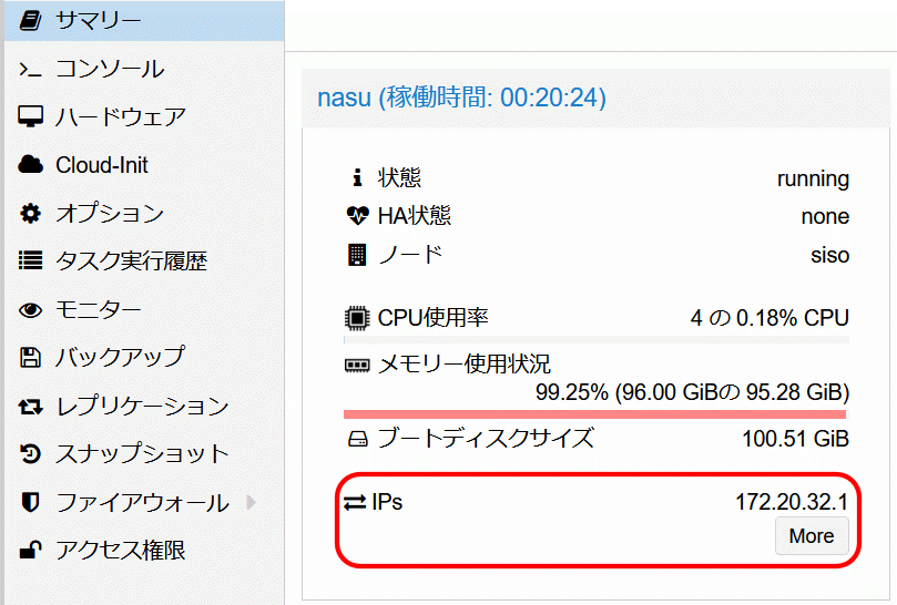 Proxmox VEの仮想マシンのサマリーで、VMのIPアドレスが表示されればゲストエージェントが問題なく動いていると分かる。