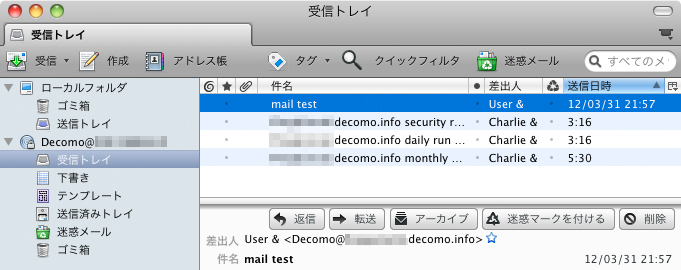 ソースの表示以前のリビジョンバックリンク全て展開する/折り畳む文書の先頭へ Share via Share via... Twitter LinkedIn Facebook Pinterest Telegram WhatsApp Yammer Reddit Teams最近の変更Send via e-Mail印刷パーマリンク × 目次 FreeBSD 9.0RでCourier Mail Serverを使う 環境 本記事で出来るようになること 用語メモ インストール 設定 Courier Mail Server全体の設定 Maildirの準備 sendmailとの入れ替え メール送受信テスト aliasesの編集 IMAPを使えるようにする IMAP over SSL(IMAPs)を使うようにする FreeBSD 9.0RでCourier Mail Serverを使う 環境 FreeBSD 9.0-RELEASE Courier Mail Server 0.65.3 Maildirで運用 Maildirは ~/Library/mail/メールアドレス/ に置く ユーザーの標準メールのデータは ~/Library/mail/_local/Maildir に保存する 本記事で出来るようになること システムのメールサーバを標準のsendmailからCourier Mail Serverに置き換える。 ユーザーのメールをIMAPで読み書きする。 ユーザーのメールをIMAPsで読み書きする。 用語メモ /etc/mail/aliases メールエイリアスの設定ファイル。メールサーバに登録されているユーザーアカウントの別名(エイリアス)、転送(root宛のメールをadmin@〜にも送るとか)、メーリングリストの設定などが行える。 /etc/mail/mailer.conf /usr/sbinにあるメール関連コマンド(実体はmailwrapperへのシンボリックリンク)と、実際のメール関連コマンドの対応表。/usr/sbin以下のメールコマンドが呼び出されると、mailwrapperはこの設定ファイルに基づいてメールコマンド本体を呼び出す。 インストール portで一発。 cd /usr/ports/mail/courier sudo make install 仮想メールボックスの利用を見据え、AUTH_PGSQLやAUTH_USERDBあたりのコンフィグオプションを有効にする。 単にsendmailの置き換えだけなら、特に弄らなくてもいいと思う。 インストールの最後に「Would you like to activate Courier in /etc/mail/mailer.conf [n]?」と聞かれるので、yでmailer.confを置き換える。一応、Courier Mail Server用のmailer.confを掲載。 /etc/mail/mailer.conf # # Execute the Courier sendmail program, named /usr/local/bin/sendmail # sendmail /usr/local/bin/sendmail send-mail /usr/local/bin/sendmail mailq /usr/local/bin/mailq newaliases /usr/local/sbin/makealiases 設定 Courier Mail Server全体の設定 /usr/local/etc/courier/courierdで、Courier Mail Server全体の設定を行う。詳細はcourierdを参照。 ここでは変更した箇所のみを掲載する。 /usr/local/etc/courier/courierd LANG=ja_JP.utf-8 DEFAULTDELIVERY=./Library/mail/_local/Maildir また、 ログインアカウント名に大文字を含むユーザーがいる 今後作る予定がある 場合は/usr/local/etc/courier/locallowercaseを消すか、別名にする。さもないと、そのユーザーはUnknownとなりメールが届かない。うちではlocallowercase.disableにリネームして対処した。 authlibの設定 portのインストールオプションで追加のAUTH_*オプション選んでいる場合、とりあえずauthpamを使うようにしておく。 /usr/local/etc/authlib/authdaemonrc authmodulelist="authpam" authmodulelistorig="authpam" Maildirの準備 各ユーザーのホームディレクトリにMaildirを作成する。 cd ~ mkdir -p Library/mail/_local maildirmake Library/mail/_local/Maildir 新規ユーザー用に/usr/share/skelにも、同様にMaildirのスケルトンを作成する。 cd /usr/share/skel sudo mkdir -p Library/mail/_local sudo maildirmake Library/mail/_local/Maildir sendmailとの入れ替え sendmailを止める。 sudo /etc/rc.d/sendmail stop sendmailのメンテナンスルーチンを止める。 /etc/periodic.conf daily_clean_hoststat_enable="NO" daily_status_mail_rejects_enable="NO" daily_status_include_submit_mailq="NO" daily_submit_queuerun="NO" sendmailの無効化とCourier Mail Serverの有効化。 /etc/periodic.conf sendmail_enable="NO" sendmail_submit_enable="NO" sendmail_outbound_enable="NO" sendmail_msp_queue_enable="NO" courier_authdaemond_enable="YES" courier_enable="YES" Courier Mail Serverを起動。 sudo /usr/local/etc/rc.d/courier-authdaemond start sudo /usr/local/etc/rc.d/courier start もしくは、マシンを再起動する。 メール送受信テスト 自分宛にメールを送ってみる。 $ mail Decomo Subject: Courier Mail Server test send to Decomo . EOT ログが↓な風になっていれば、送信成功。 Mar 30 22:23:59 Hoge-host courierd: newmsg,id=00000049.000000004F75B3EF.000006EA: dns; localhost (localhost [127.0.0.1]) Mar 30 22:23:59 Hoge-host courierd: started,id=00000049.000000004F75B3EF.000006EA,from=<Decomo@Hoge-host>,module=local,host=Decomo!!1001!1001!/home/Decomo!!,addr=<Decomo> Mar 30 22:23:59 Hoge-host courierd: Waiting. shutdown time=none, wakeup time=none, queuedelivering=1, inprogress=1 Mar 30 22:24:00 Hoge-host courierlocal: id=00000049.000000004F75B3EF.000006EA,from=<Decomo@Hoge-host>,addr=<Decomo@Hoge-host>,size=405,success: Message delivered. Mar 30 22:24:00 Hoge-host courierd: completed,id=00000049.000000004F75B3EF.000006EA Mar 30 22:24:00 Hoge-host courierd: Waiting. shutdown time=Fri Mar 30 23:13:47 2012, wakeup time=Fri Mar 30 23:13:47 2012, queuedelivering=0, inprogress=0 muttで受信出来たか確認(mailコマンドはMaildirに対応しておらず、No mailになってしまうので注意)。 aliasesの編集 良い子の皆は、root宛のメール転送先を既に適切に設定していると思うが、俺は設定を忘れていたのでここで設定しておく。 /etc/aliases root: Decomo エイリアスデータベースを更新。 sudo newaliases IMAPを使えるようにする /usr/local/etc/courier/imapdを編集する。 /etc/periodic.conf IM