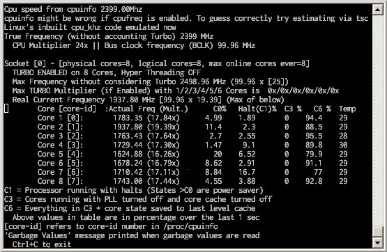 ソースの表示以前のリビジョンバックリンク全て展開する/折り畳む文書の先頭へ Share via Share via... Twitter LinkedIn Facebook Pinterest Telegram WhatsApp Yammer Reddit Teams最近の変更Send via e-Mail印刷パーマリンク × 目次 FreeBSDでi7zを使ってCPUのCステートを見る 試した環境 インストール 実行 FreeBSDでi7zを使ってCPUのCステートを見る portsのsysutils/i7zを使うとCPUコア毎の周波数、詳細なCステート、温度をリアルタイムで確認することが出来る。省電力設定してみたものの、本当に効いてるかどうか確認したい時にとても便利。 試した環境 FreeBSD 10.1-RELEASE-p10 i7z 0.27.2 Intel(R) Atom C2750 名前の通りIntelのCPUでしか使えない(AMDは動作未確認。そもそも仕様として詳細なCステート情報が取れなかった気がする)。また、Core-i系向けとなっているが、うちのAtom C2750でも動作しているのでNehalem以降のIntel CPUなら基本大丈夫なんじゃなかろうか。 インストール portmaster sysutils/i7z 実行 # i7z ↓のような感じでモニタリングでき、しっかりとC6ステートまで落ちていることが分かる。 manを見るとファイルにログを取ったりも出来る模様。 sysctl dev.cpu.0.cx_supported dev.cpu.0.cx_usageとすれば同様の情報が見られはするが、i7zの方が詳細かつ分かりやすいのでオススメ。 freebsd/freebsd_i7z.txt 最終更新: 2017-05-30 16:46by Decomo