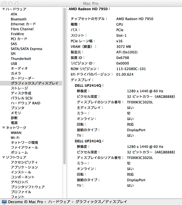 ソースの表示以前のリビジョンバックリンク全て展開する/折り畳む文書の先頭へ Share via Share via... Twitter LinkedIn Facebook Pinterest Telegram WhatsApp Yammer Reddit Teams最近の変更Send via e-Mail印刷パーマリンク × 目次 旧型Mac Pro + RADEON HD 7970 + UP2414Qで無理矢理4k@60Hzを使う 用意するもの 設定方法 後書き コメント 旧型Mac Pro + RADEON HD 7970 + UP2414Qで無理矢理4k@60Hzを使う 4k元年と言われた2014年も残すところ後2ヵ月を切り、UP2414Q祭りから1年が経とうとしているが、4kを取り巻く状況は未だ芳しくないように思う。同じくDELLのUltraSharp 2405FPW祭りの時とは違い、ハード・ソフトの両面で環境が整ってないのが大きいんだろうなぁと。あの時も一部グラボとの相性などはあったものの、普及していたDVI-Dを使って殆どの環境でそのままWUXGAが出た。 しかしながら、今回はハード面では普及しているとは言い難いDisplayPortで、しかもMSTで内部的には2画面別々に伝送するという見るからに地雷感たっぷりの方式。ソフト面でも所謂HiDPI対応がOS、アプリともに進んでなかったり、前述のMST絡みでビデオドライバがこなれておらずにバグりまくりだったりと、阿鼻叫喚地獄絵図。それでも最近はマシになってきたようだが、MSTの(仕様上の)残念さ加減は如何ともし難い。 ことMacに関しては、HiDPI対応は殆ど問題なかったが、林檎が公式に4k対応を謳っている機種を除いてOSとドライバの対応度が今なお絶望的な状況である。うちの旧型Mac Proちゃん(Early 2009だがファーム書き換えでMid 2010になってる怪しいマシン)もハード的には4k@60Hzに対応してるハズなんだが、OS Xではまともに出ない(BootCampのWin7では出る)。うちの環境でMSTを有効にすると、画面が左右に分割され2つのデスクトップが表示されるという悲しい状況に…。ピクチャーバイピクチャー状態と言った方が分かりやすいか。要はMSTの実装通りモニタ2台分として認識されちゃってる訳。 なぜ林檎は変な制限を加えるのか……。 まぁ、現状を嘆いても仕方ない。とりあえず、OS Xで無理矢理3840×2160をHiDPIの60Hzで無理矢理使う方法を見つけたので書いておく。 用意するもの EFI化したRADEON HD 7000系のグラボ SwitchResX OS X 10.9.3以上 グラボのEFI化は必須。PC BIOSのままだとMSTを有効にしても30Hzが上限になる(MSTが使われないっぽい?)。 HD7000系と書いたものの、実質7850/7870/7950/7970の何れかになる。これら以外の7000系はうまくEFI化出来ないので。多分R9シリーズでも行けると思う。 設定方法 モニタのDP 1.2/MSTを有効にする。 システム環境設定のディスプレイの配置で、左右の繋がりを良い感じに修正する。 システム環境設定のMission Controlで「ディスプレイごとに個別の操作スペース」を外す。 SwitchResXで各モニタの解像度を1280×1440, 60Hz HiDPIにする。 以上で60HzのなんちゃってWQHDのHiDPIデスクトップになる。見ての通りモニタ2台扱いの残念仕様からは逃れられず、見た目は極めてアホっぽくなるがこの際仕方ない…。壁紙を変えれば多少はマシになると思う。 「ディスプレイごとに個別の操作スペース」のチェックは外しておかないと、デスクトップを跨いだウィンドウの表示が出来ず使い物にならないので要注意。 2画面を1枚のモニタで表示してる状態なので、ウィンドウの最大化や、ウィンドウの位置によってはツールチップ・ドロップダウンメニューの出方が変になったりするが、まぁ致命的ではないだろう。どっちかっていうと、GPUを使うアプリが起動しなかったりアクセラレーションが機能してないかもっていう方が問題(個人的にそこまで困ってないので深くは調べてない。) システム情報はこんな感じ。 後書き 海外フォーラムだと、うちと似た環境で普通に4k 60Hz出せてる事例が見つかるのが謎。うちと似たっていうよりも、うちがそっちに似せたんで出せても良いはずなんだけどなー。ダメな理由が分からん。あるとすればUP2414QのRev違いか…? 4k対応Macを極一部に限っていたり、満を持して刷新したMac miniが今のところ4k 60Hz対応してない所を見るに、林檎は外部モニタでの4kサポートは消極的に見える。5k iMacでやれってのが回答なんだろうなぁ。 コメント フルネーム: メールアドレス: ウェブサイト: コメントを入力. Wiki文法が有効です: 人間の証明として、ボックス内の全ての文字を入力してください。 この項目は空のままにして下さい: コメントの購読 mac/classical_mac_pro_force_4k_60hz.txt 最終更新: 2015-01-06 11:51(外部編集)