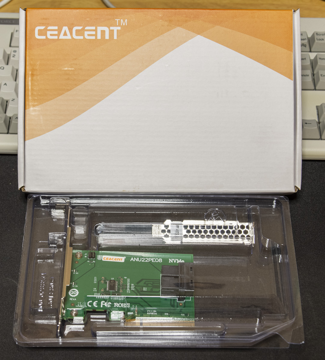 PCIe x8をMini-SAS HD×2個に変換するライザーカードはANU22PE08を使った。Mini-SAS HD→U.2のケーブル2本付きでeBayで6000円程だった。コロナの影響で到着まで3か月ほどかかったが、届いただけマシか。