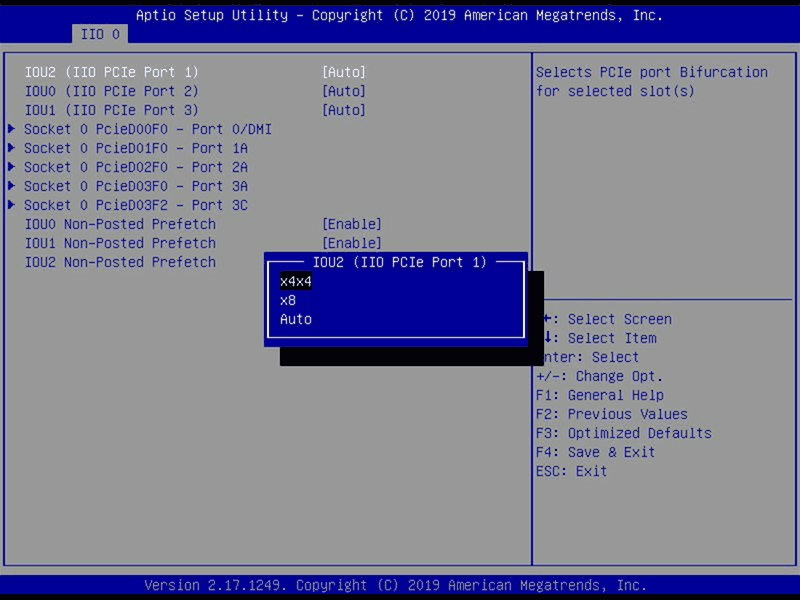 ライザーカードをマザボのPCIe x8スロットに装着し、BIOSでスロットのPCIe bifurcations設定を「x4x4」にする。X10DRiの設定項目は Advanced→Chipset Configuration→North Bridge→IIO Configuration→IIO0 Configuration にある。