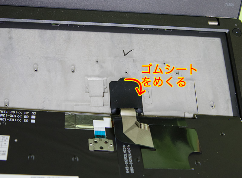 キーボードを手前に引くと本体から外れる。裏側にマザーボードに繋がるフレキがあるので注意。ゴムの蓋をめくると、キーボードをつなぐコネクタがある。慎重にフレキケーブルを取り外し、キーボードを入れ替える。