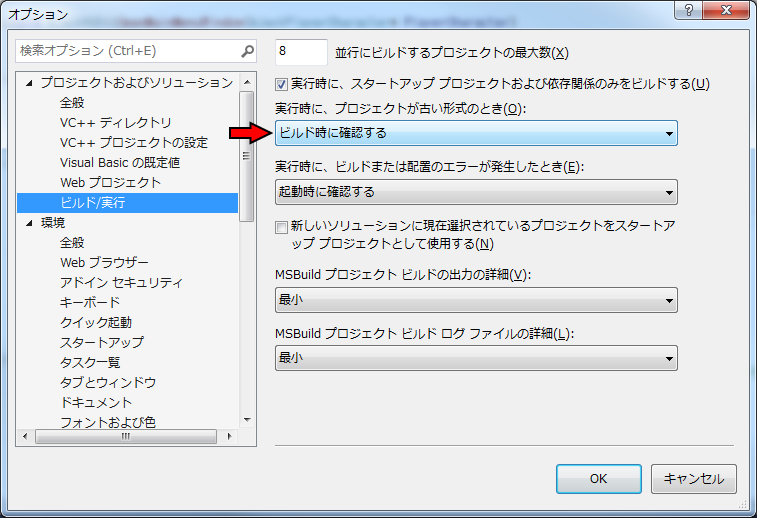 再びこのダイアログを出すようにするには、ツールオプションプロジェクトおよびソリューションビルド/実行とたどり、「実行時に、プロジェクトが古い形式のとき」ドロップダウンメニューで「ビルド時に確認する」を選べば良い。
