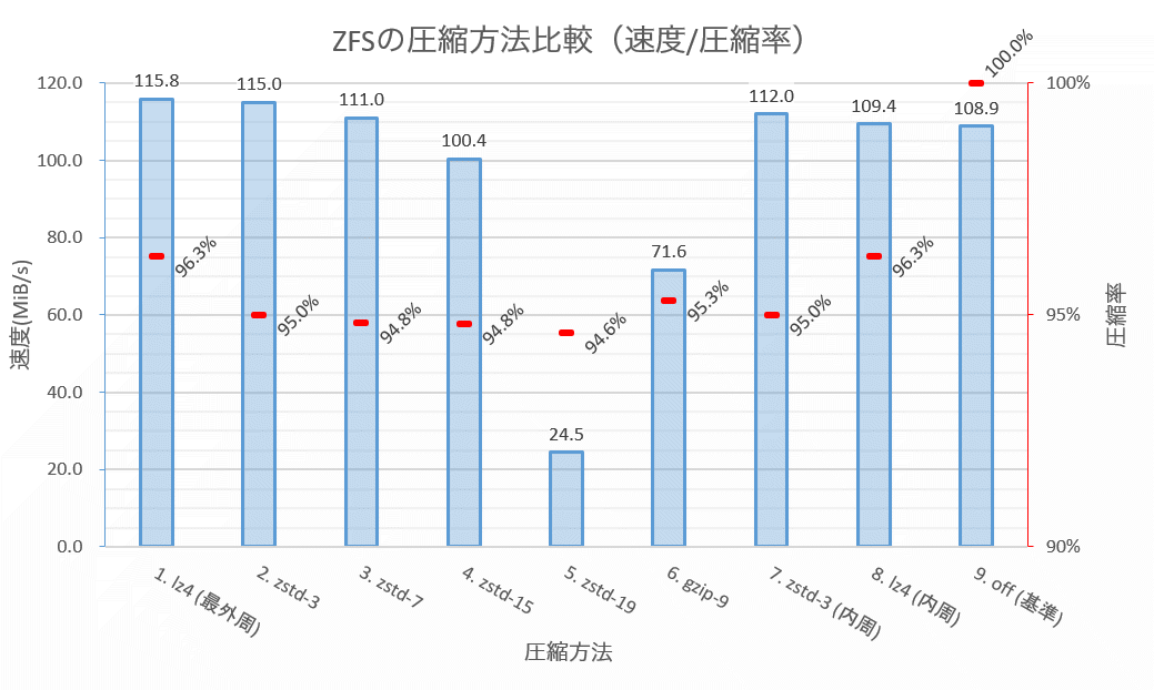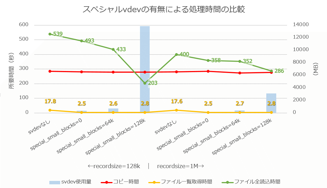 ソースの表示以前のリビジョンバックリンク全て展開する/折り畳む文書の先頭へ Share via Share via... Twitter LinkedIn Facebook Pinterest Telegram WhatsApp Yammer Reddit Teams最近の変更Send via e-Mail印刷パーマリンク × ZFSのSpecial vdevを試してみる 階層化ストレージのZFS版ともいえるSpecial vdevとSpecial Allocation Classについて、1年程前に当サイトでも解説した。いつか試そうと思いつつ延び延びになっていたが、いよいよ導入の機運が高まってきたので簡単にテストした。 コマンド まずはコマンドの確認から。以下、da0p1をノーマルvdev(プール本体のストレージ)、da6p1をスペシャルvdevとする。 スペシャルvdev付きプールを作る。vdevタイプとしてspecialを指定し、その後にスペシャルvdevに割り当てるデバイスを指定する。 # zpool create -O atime=off ztest da0p1 special da6p1 $ zpool status ztest pool: ztest state: ONLINE config: NAME STATE READ WRITE CKSUM ztest ONLINE 0 0 0 da0p1 ONLINE 0 0 0 special da6p1 ONLINE 0 0 0 既存のプールにスペシャルvdevを追加する場合はzpool addで同様に指定する。 # zpool add ztest special da6p1 スペシャルvdevの削除。これはL2ARCやslogの削除なんかと一緒。 # sudo zpool remove ztest da6p1 OpenZFS 2.1.4の時点において、RAIDZプールに追加したスペシャルvdevは削除できないので注意!!(トップレベルvdev削除の制限事項)。 スペシャルvdevデバイスの増減(zpool attach/detach)は可能だが、いざzpool removeしようとするとinvalid config; all top-level vdevs must have the same sector size and not be raidz.エラーとなり削除できない。 slogやL2ARCは削除できるのにどうして…… ただし、remove後にスペシャルvdevからノーマルvdevへ、データの退避が行われる。 $ zpool status ztest pool: ztest state: ONLINE remove: Evacuation of /dev/da6p1 in progress since Wed Feb 23 16:50:17 2022 2.77G copied out of 13.5G at 142M/s, 20.54% done, 0h1m to go config: NAME STATE READ WRITE CKSUM ztest ONLINE 0 0 0 da0p1 ONLINE 0 0 0 special da6p1 ONLINE 0 0 0 $ zpool iostat -v ztest capacity operations bandwidth pool alloc free read write read write ---------- ----- ----- ----- ----- ----- ----- ztest 14.4G 9.13T 16 68 215M 220M da0p1 932M 9.09T 0 68 0 220M special - - - - - - da6p1 13.5G 36.0G 16 0 215M 0 ---------- ----- ----- ----- ----- ----- ----- 退避が完了するとプールからデバイスが除去される。 $ zpool status ztest pool: ztest state: ONLINE remove: Removal of vdev 1 copied 13.5G in 0h1m, completed on Wed Feb 23 16:51:31 2022 27.4K memory used for removed device mappings config: NAME STATE READ WRITE CKSUM ztest ONLINE 0 0 0 da0p1 ONLINE 0 0 0 スペシャルvdevは標準でメタデータのみを格納する設定となっている。小ブロックデータの格納を有効にするには、ファイルシステム毎のプロパティspecial_small_blocksを0以外の2の冪数に設定する。 # zfs set special_small_blocks=64k ztest/R/pictures $ zfs get -r special_small_blocks ztest NAME PROPERTY VALUE SOURCE ztest special_small_blocks 0 default ztest/R special_small_blocks 0 default ztest/R/pictures special_small_blocks 64K local スペシャルvdevが使われてるかどうかはzpool iostat -vで確認できる。書き込み中に見てみると、しっかりスペシャルvdevも使われていることがわかる。 capacity operations bandwidth pool alloc free read write read write ---------- ----- ----- ----- ----- ----- ----- ztest 11.7G 9.13T 0 1.36K 0 213M da0p1 11.4G 9.08T 0 215 0 207M special - - - - - - da6p1 277M 49.2G 0 1.15K 0 6.22M ---------- ----- ----- ----- ----- ----- ----- テスト スペシャルvdevの有無、special_small_blocksのサイズ、レコードサイズの違いで簡単にテストを行う。 テスト環境 テストデータ 72208ファイル、10.3GiB(平均ファイルサイズ:150KiB) Special vdevの効果が出やすいであろう、大量の小サイズの画像ファイル群 テストマシン OS: FreeBSD 13.0-RELEASE-p6 on Proxmox VE 7.1 CPU: 4 vCPU (Xeon E5-2680v4. オーバーコミットなし) RAM: 32GB HDD: コピー元: 単体 (仮想ディスク50GB/実態はU.2 SSD) コピー先: 単体 (10TB 7200RPM SATA HDD×1) コピー先のプールのスペシャルvdevの有無によって、以下の項目を測定する。 コピー元→コピー先へのファイルコピー所要時間(rsync -aX src dst/) コピー先でファイルの全走査にかかる時間(find dst > /dev/null) コピー先でファイルの全読込にかかる時間(find dst -print0 | xargs -0 cat) ARCの影響を避けるため、プールは都度作成し、rsync後はマシンを再起動する。その後、ファイル走査→全読込の順で実行する。 テスト結果 仮想マシン上での実行のため、結果にはノイズが多く含まれていることに注意。 recsize special_small_blocks コピー時間(秒) ファイル走査時間(秒) ファイル読込時間(秒) スペシャルvdev使用量(MiB) 備考 128k - 284 17.8 539 - Special vdevなし 0 281 2.5 493 319 メタデータのみSpecial vdevを利用 4k - - - 320 sdev容量のみ測定 8k - - - 321 16k - - - 322 32k - - - 336 64k 279 2.6 433 684 128k 280 2.8 203 13824 全データがSpecial vdevに行く 1M - 280 17.6 400 - Special vdevなし 0 285 2.5 358 34 4k - - - 35 sdev容量のみ測定 8k - - - 36 16k - - - 37 32k - - - 52 64k 274 2.7 352 400 128k 276 2.8 286 3102 ※special_small_blocks=4k~32kは後から測定したため、スペシャルvdevの容量のみ。グラフには加えていない。1MBずつ増えてて本当かよ?と思ったが、再度試しても同じだったので間違ってるわけではなさそう。 スペシャルvdevの有無でファイルコピー(