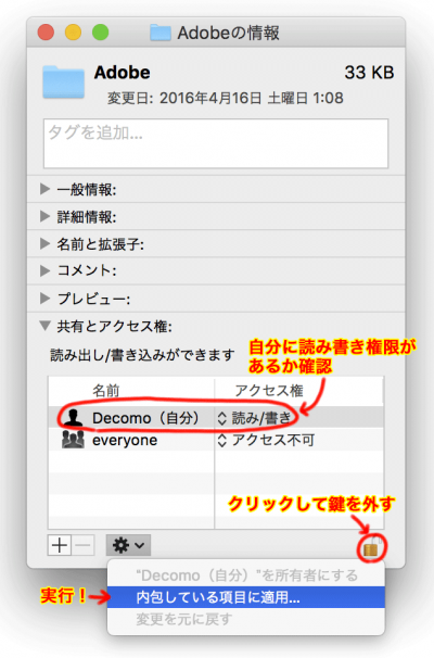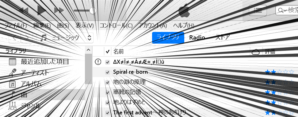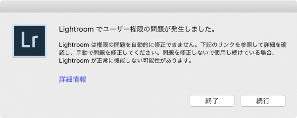 ソースの表示以前のリビジョンバックリンク全て展開する/折り畳む文書の先頭へ Share via Share via... Twitter LinkedIn Facebook Pinterest Telegram WhatsApp Yammer Reddit Teams最近の変更Send via e-Mail印刷パーマリンク × iTunesでファイルのリンクが切れた曲をリストアップする方法 マシン移行などでiTunesライブラリを移動した際、ファイルが行方不明となり曲とのリンクが切れることがある。曲名の先頭にビックリマークが付く忌まわしきアレ。 アルバム単位でごっそりリンク切れしてくれれば分かりやすいが、数万曲あるうちの数曲とかだと実に厄介だ。リンク切れ曲を一挙にリストアップする方法を探してたら、海外フォーラムで実に巧妙な方法が紹介されていた。備忘録と困っている人のために画像付きでリストアップ方法を解説する。 1. 「ファイルがある曲」プレイリストを作る iTunesメニューのファイル→新規→プレイリストをクリックし、新規プレイリストを作る。名前なんでもいいんだけど、分かりやすく「ファイルがある曲」とでもしておく。 iTunesの左ペイン→ライブラリ→曲をクリックし、Ctrl+A (Command+A)で全曲を選択する。そして任意の曲の上で右クリック→プレイリストに追加で、先ほどの「ファイルがある曲」を選ぶ。 プレイリストへ曲を追加する際、iTunesはファイルの有無を確認しているそうだ。今回は全曲なので、追加が終わるまで結構待たされる。その間、プログレスバーとかは出ずiTunesが固まった状態になるが、お茶でも飲みつつ辛抱強く待つ。処理が終わればiTunesが再び操作できるようになる。 リンク切れファイルがあれば、この段階でライブラリの曲数とプレイリストの曲数に差が出る。 2. 「ファイルがない曲」スマートプレイリストを作る 続いて「ファイルがない曲」を探し出すスマートプレイリストを作る。 iTunesメニューのファイル→新規→スマートプレイリストをクリックし、以下の条件で「ファイルがない曲」リストを作る。 次のルールに一致 → ✅チェック 対象メディア:ミュージック 「プレイリストが」「ファイルがある曲」「ではない」 上限 → チェックしない チェックマークのある項目だけ選択する → ☐チェックしない ライブアップデート → ✅チェック 3. リンク切れの曲を確認 「ファイルがない曲」スマートプレイリストに、リンク切れ曲が列挙されていることを確認する。 上図ではビックリマークの有無が混在しているが、実際は全てリンク切れの曲である。通常のプレイリストと違い、スマートプレイリストでは曲を再生する時にファイルの有無チェックが行われるそうな。 あとは地道にリンク切れファイルを選択しなおすだけ(´・ω・`) Lightroomでユーザー権限も問題が発生しました。 MacでLightroomを起動したら「Lightroomでユーザー権限の問題が発生しました。」というエラーダイアログが表示された。 「修復して続行」ボタンを押しても「権限の問題を自動的に修復できません。」とつれない返事。 仕方ないので詳細情報をクリックしたら、英語の解説ページに飛びやがんの。Adobeの代わりに日本語のページも張っておきまつね。 直し方は解説ページのとおりで、次のディレクトリのパーミッションを修正してやればよい。 ~/Library/Preferences/ ~/Library/Application Support/Adobe/ ~/Library/Caches/Adobe/ ~/Documents/Adobe ~/ってのは自分のユーザーディレクトリを表す表記で、いわゆる「/Users/ユーザー名/」の事。正式な表記なので覚えておくと便利だよ。 ~/Libraryは隠しフォルダでありFinderには通常表示されない。Finderメニューの「編集>フォルダへ移動」で開くダイアログに「~/Library」と入力し「移動」すれば表示できる。「~/Li」まで打ってTABキーを押すと「~/ライブラリ」という具合に入力補完してくれるので便利だよ。 このとき、正しく~/Libraryと入れているにもかかわらず、なぜかシステムのライブラリフォルダ(/Library)が表示される事があるので要注意。また、LibraryとDocumentsは日本語版ではそれぞれ「ライブラリ」「書類」という表記になる点にも注意されたし。どうしてもユーザーライブラリフォルダに移動しない時は、ターミナル.appを開いて「open ~/Library」を実行すれば開くよ。 あとは各フォルダの「情報を見る」で以下の項目の確認&設定をする。変更する時はおなじみ南京錠マークをクリックしてね。 「共有とアクセス権」で、自分のユーザーアカウントに「読み/書き」のアクセス権があるか。なければ追加&変更。 歯車アイコンをクリックし、「内包している項目に適用」をクリック。 2つ目の「内包している項目に~」がとても重要。前述の各ディレクトリのアクセス権は正しいものの、格納されているファイル/フォルダのアクセス権が原因の事が往々にしてある。今回の当方の原因もそうだった。 MozJPEGのjpegtranによるJPEG圧縮最適化が凄い件 とても今更なんですけどね、Mozilla謹製JPEGライブラリ群の一部、jpegtranによるJPEG最適化の効果に驚愕しとるわけです。 PENTAX K-1を買ってからというものPCのス