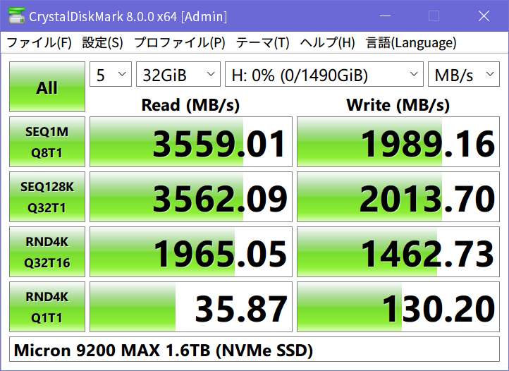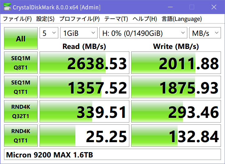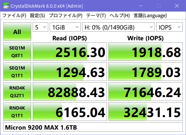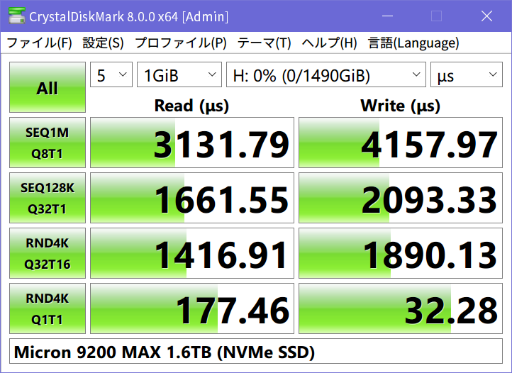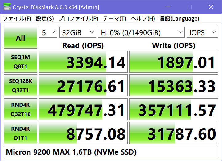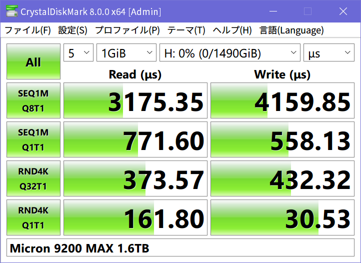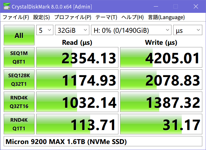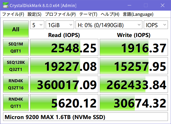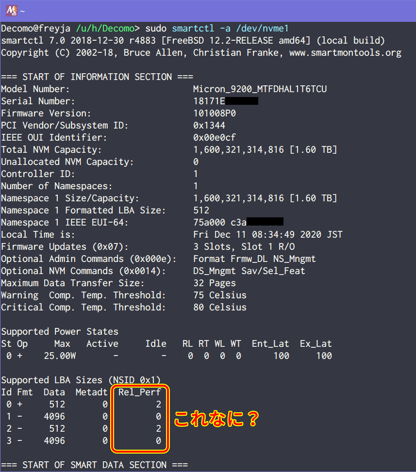 ソースの表示以前のリビジョンバックリンク全て展開する/折り畳む文書の先頭へ Share via Share via... Twitter LinkedIn Facebook Pinterest Telegram WhatsApp Yammer Reddit Teams最近の変更Send via e-Mail印刷パーマリンク × WD SN640のファームウェア更新とかベンチマークとか こちらのページによれば、Western Digital Ultrastar DC SN640 U.2 NVMe SSDシリーズの初期ファームには、まれにSSDがタイムアウトし、機能不全を引き起こす可能性のあるバグがあるらしい。回復手段はSSDのフォーマットで、言わずもがなデータは失われることになる。あな恐ろし。 配布されている修正版ファームウェアはR1110021, R1410004で、手持ちのSN640はR1110012なので発生する可能性がありそう。というわけで更新してみる。 やり方は上記サイトに書いてある通り。Linux環境ならnvmeコマンドでSSDのFWをダウンロードし、適用し、マシンを再起動する。 nvme fw-download /dev/nvme0 --fw=FW.vpkg nvme fw-commit /dev/nvme0 -a 1 こんな感じでR1110021に更新されていることが分かる。 # nvme list | grep WUS4 /dev/nvme2n1 /dev/ng2n1 A06F8XYZ WUS4BB076D7P3E3 1 7.68 TB / 7.68 TB 4 KiB + 0 B R1110021 /dev/nvme1n1 /dev/ng1n1 A066EXYZ WUS4BB076D7P3E3 1 7.68 TB / 7.68 TB 4 KiB + 0 B R1110021 /dev/nvme0n1 /dev/ng0n1 A0647XYZ WUS4BB076D7P3E3 1 7.68 TB / 7.68 TB 4 KiB + 0 B R1110021 なお、このSN640たちは例によって中古で、いずれも2PB以上読み書きされている。データシート上の寿命は11210TBW(4kランダムライト時)であるから、S.M.A.R.T.が示すとおりまだまだ余裕がありそう。 CrystalDiskMarkとCrystalDiskInfoの結果は以下の通り。PCIeパススルーでVMで測定したものなので、値は参考程度に。 ------------------------------------------------------------------------------ CrystalDiskMark 9.0.1 x64 (C) 2007-2025 hiyohiyo Crystal Dew World: https://crystalmark.info/ ------------------------------------------------------------------------------ * MB/s = 1,000,000 bytes/s [SATA/600 = 600,000,000 bytes/s] * KB = 1000 bytes, KiB = 1024 bytes [Read] SEQ 1MiB (Q= 8, T= 1): 2794.207 MB/s [ 2664.8 IOPS] < 2999.14 us> SEQ 128KiB (Q= 32, T= 1): 3284.428 MB/s [ 25058.2 IOPS] < 1272.22 us> RND 4KiB (Q= 32, T=16): 600.710 MB/s [ 146657.7 IOPS] < 615.42 us> RND 4KiB (Q= 1, T= 1): 38.750 MB/s [ 9460.4 IOPS] < 105.45 us> [Write] SEQ 1MiB (Q= 8, T= 1): 2009.656 MB/s [ 1916.6 IOPS] < 4162.21 us> SEQ 128KiB (Q= 32, T= 1): 2015.298 MB/s [ 15375.5 IOPS] < 2077.10 us> RND 4KiB (Q= 32, T=16): 523.224 MB/s [ 127740.2 IOPS] < 237.16 us> RND 4KiB (Q= 1, T= 1): 140.593 MB/s [ 34324.5 IOPS] < 28.90 us> Profile: Default Test: 1 GiB (x3) [E: 0% (0/7154GiB)] Mode: [Admin] Time: Measure 5 sec / Interval 5 sec Date: 2025/06/22 13:52:58 OS: Windows 10 Pro 21H2 [10.0 Build 19044] (x64) Comment: WD SN640 7.68TB (WUS4BB076D7P3E3) on VM シーケンシャルは概ねデータシートどおりだが、ランダムのIOPSが1/2~1/3と振るわないのはパススルーの影響なのかしら? 参考サイト Western Digital SN640 firmware updates R1110021 and R1410004 - Thomas-Krenn-Wiki-en thomas-krenn/SN640-FW-Update 5年半使ったIntel DC S3500 240GBの状態とベンチマーク ファイルサーバで使ってたInte SSD DC S3500 240GB (SSDSC2BB240G4)がお役御免となった。購入記録を採ってるわけじゃないけど、たぶんこの時のSSD⇒Intel SSDSC2BB240G4 (DC S3500 240GB) のベンチマーク。のちに同じSSDを中古購入し、2台でRAID組んでWindows Serverのシステム領域兼記憶域階層のSSD層として使っていた。先に買った方、つまり当時のベンチマークがある方の使用時間は5年半ほどになる。 経年でどの程度パフォーマンスが変わったのか比較してみた。 今 5年半前 S.M.A.R.T. CrystalDiskMark 6 ----------------------------------------------------------------------- CrystalDiskMark 6.0.2 x64 (C) 2007-2018 hiyohiyo Crystal Dew World : https://crystalmark.info/ ----------------------------------------------------------------------- * MB/s = 1,000,000 bytes/s [SATA/600 = 600,000,000 bytes/s] * KB = 1000 bytes, KiB = 1024 bytes Sequential Read (Q= 32,T= 1) : 504.027 MB/s Sequential Write (Q= 32,T= 1) : 290.264 MB/s Random Read 4KiB (Q= 8,T= 8) : 312.603 MB/s [ 76319.1 IOPS] Random Write 4KiB (Q= 8,T= 8) : 263.048 MB/s [ 64220.7 IOPS] Random Read 4KiB (Q= 32,T= 1) : 311.353 MB/s [ 76013.9 IOPS] Random Write 4KiB (Q= 32,T= 1) : 253.603 MB/s [ 61914.8 IOPS] Random Read 4KiB (Q= 1,T= 1) : 21.859 MB/s [ 5336.7 IOPS] Random Write 4KiB (Q= 1,T= 1) : 66.980 MB/s [ 16352.5 IOPS] Test : 4096 MiB [I: 0.0% (0.1/223.6 GiB)] (x3) [Interval=5 sec] Date : 2023/10/11 0:36:19 OS : Windows 10 Professional [10.0 Build 19045] (x64) Intel DC S3500 240GB SSDSC2BB240G4 (2) ----------------------------------------------------------------------- CrystalDiskMark 6.0.0 x64 (C) 2007-2017 hiyohiyo Crystal Dew World : https://crystalmark.info/ ----------------------------------------------------------------------- * MB/s = 1,000,000 bytes/s [SATA/600 = 600,000,000 bytes/s] * KB = 1000 bytes, KiB = 1024 bytes Sequential Read (Q= 32,T= 1) : 509.971 MB/s Sequential Write (Q= 32,T= 1) : 285.330 MB/s Random Read 4KiB (Q= 8,T= 8) : 312.081 MB/s [ 76191.7 IOPS] Random Write 4KiB (Q= 8,T= 8) : 271.718 MB/s [ 66337.4 IOPS] Random Read 4KiB (Q= 32,T= 1) : 271.167 MB/s [ 66202.9 IOPS] Random Write 4KiB (Q= 32,T= 1) : 252.995 MB/s [ 61766.4 IOPS] Random Read 4KiB (Q= 1,T= 1) : 33.345 MB/s [ 8140.9 IOPS] Random Write 4KiB (Q= 1,T= 1) : 94.851 MB/s [ 23157.0 IOPS] Test : 4096 MiB [D: 0.1% (0.1/223.4 GiB)] (x3) [Interval=5 sec] Date : 2018/03/01 1:41:52 OS : Windows 10 Professional [10.0 Build 16299] (x64) Intel SSDSC2BB240G4 CrystalDiskMark 8 なし --------------------------------------