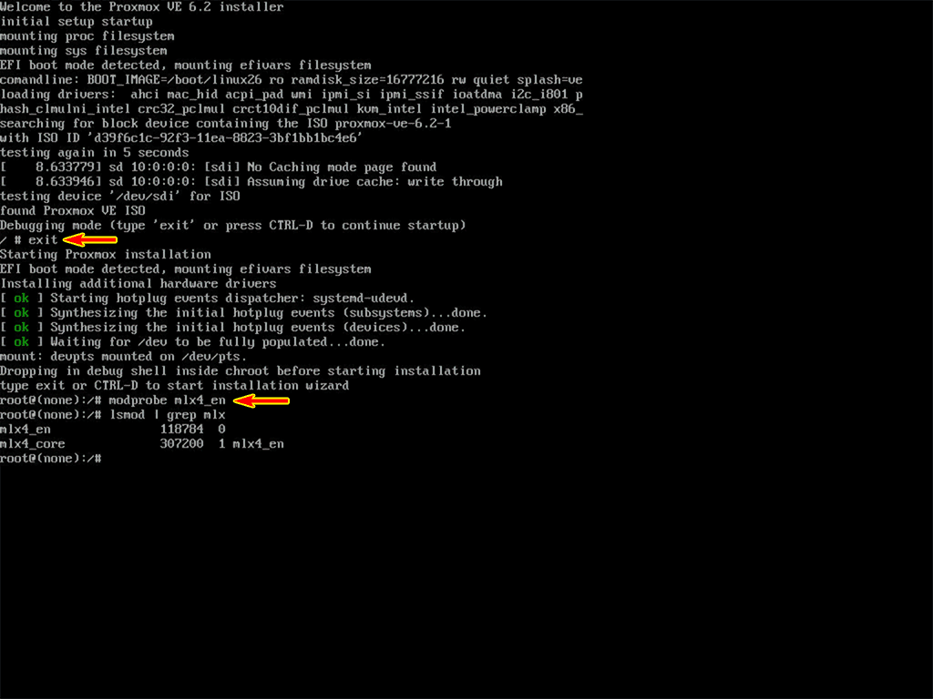 ソースの表示以前のリビジョンバックリンク全て展開する/折り畳む文書の先頭へ Share via Share via... Twitter LinkedIn Facebook Pinterest Telegram WhatsApp Yammer Reddit Teams最近の変更Send via e-Mail印刷パーマリンク × 目次 Proxmox VE 6.2のインストーラでConnectX-3 ENを認識させる 環境 手順 Proxmox VE 6.2のインストーラでConnectX-3 ENを認識させる Proxmox VE 6.2はConnectX-3用のドライバ(mlx4)を内蔵している。そのため、本来は何もせずともNICとして使えるのハズなのだが、どういうわけかインストーラではmlx4_coreは読み込まれるもののmlx4_enが読み込まれず、ConnectX-3がイーサネットデバイスとして認識されない。 本記事ではProxmox VE 6.2のインストーラでConnectX-3をイーサネットデバイスとして認識させる方法を紹介する。 環境 Proxmox VE 6.2-1 ConnectX-3 Pro EN (MCX314A-BCCT) 手順 Proxmoxインストーラをデバッグ実行し、mlx4_enモジュールを手動で読み込ませれば解決。 Proxmoxのインストーラが起動したら「Install Proxmox VE (Debug Mode)」を選ぶ。 カーネルが読み込まれるとシェルのプロンプトに落ちるので、そのままexitする。 カーネルモジュールが読み込まれたタイミングで再びプロンプトで入力待ち状態になるので、modprobe mlx4_enを実行し、ConnectX-3のイーサネットドライバを読み込ませる。 再びexitするとGUIのインストーラに戻るので、インストール作業を進める。 Management InterfaceにConnectX-3が出てくるハズ(上図のens1とens1d1。何でens1d1とens1d2じゃないんだろう…?) インストール後のProxmox環境では自動でmlx_en4が読み込まれるため、特に何もする必要はない。 virtualization/proxmox_ve_6_2_enable_connectx3_en_in_installer.txt 最終更新: 2020-12-28 09:26by Decomo