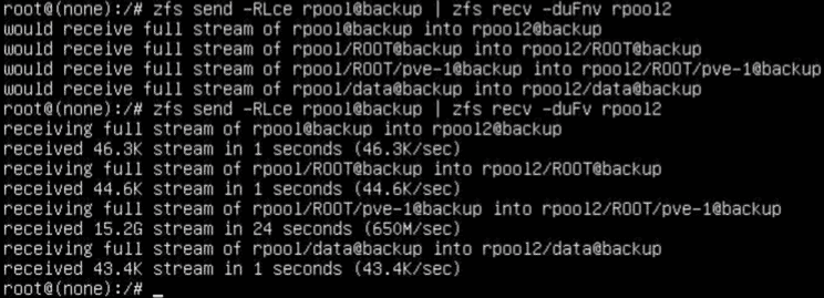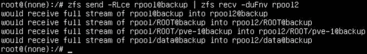 # zfs send -RLce rpool@backup | zfs recv -Fduv rpool2