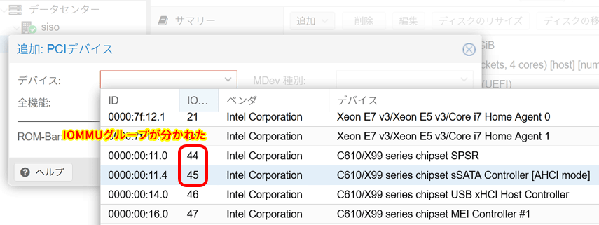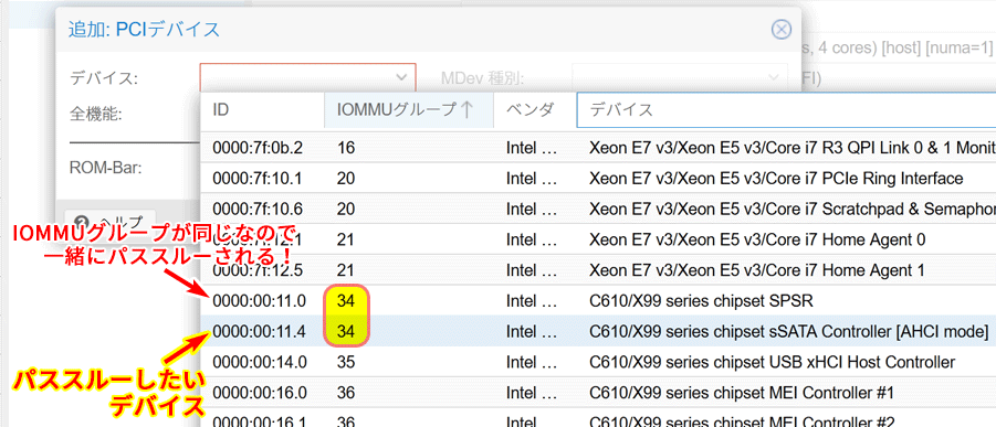 パススルーはIOMMUグループ単位で行われるため、対象デバイスと同一グループの不必要なデバイスも一緒にパススルーされてしまう。