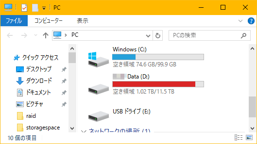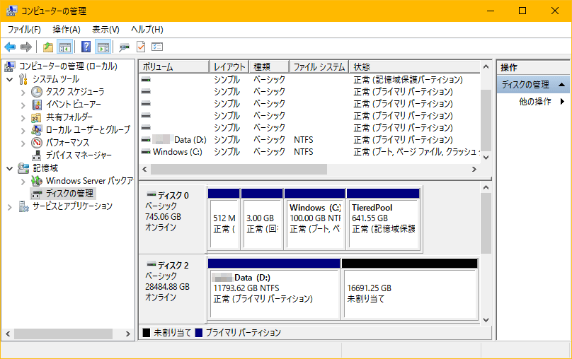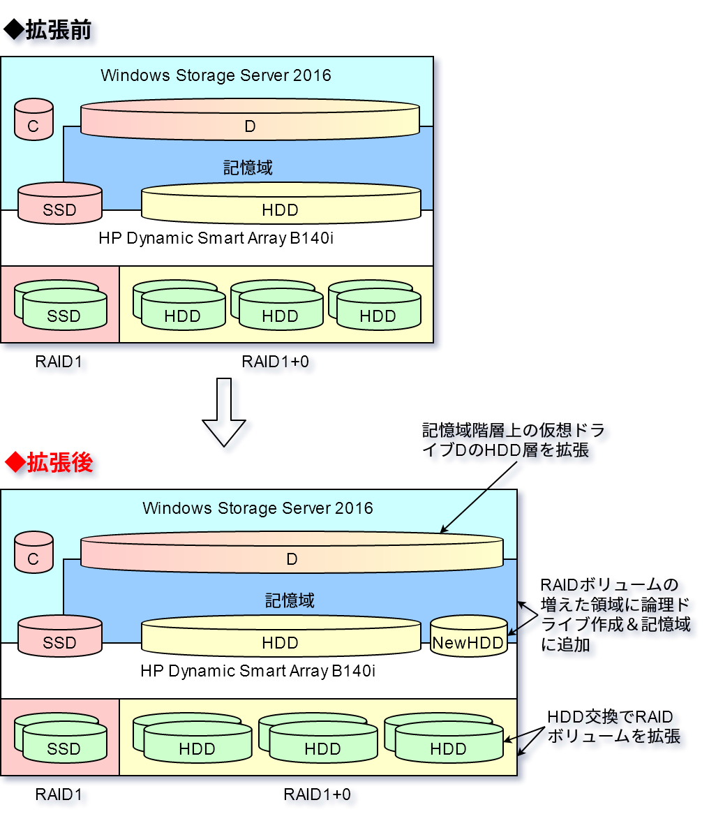 ソースの表示以前のリビジョンバックリンク全て展開する/折り畳む文書の先頭へ Share via Share via... Twitter LinkedIn Facebook Pinterest Telegram WhatsApp Yammer Reddit Teams最近の変更Send via e-Mail印刷パーマリンク × 目次 既存の記憶域階層にHDDを追加してディスク容量を拡張する 試した環境 手順 現状の確認 物理HDDの追加 HDD層の拡張 仮想ディスクの拡張 参考サイト 既存の記憶域階層にHDDを追加してディスク容量を拡張する Windows Storage Server 2016で、SSDとHDDの記憶域階層に確保している仮想ドライブの容量が不足してきたので、HDDを追加して容量を増やしてみたメモ。 試した環境 Windows Storage Server 2016 バージョン1607 SSD層640GB, HDD層10TBの記憶域階層に確保した10TBのNTFS仮想ディスク SSD層:HP Dynamic Smart Array B140iで構築したSSD×2のRAID-1から切り出した論理ドライブ HDD層:同じくHDD×2×3のRAID-10から切り出した論理ドライブ B140iは既存の論理ドライブを拡張することができない。幸い、HDD交換で増えた領域に論理ドライブを作ることはできるので、新たな論理ドライブを記憶域プールに追加するという方法を取った。 ハードウェアRAIDの論理ドライブで記憶域プールを作成するのは非推奨なのに加え、ハードウェアRAIDで1つにまとめたボリュームから作った2つの論理ドライブを記憶域プールで再度1つにまとめている。下図の通り、かなりキモい構成である。 手順 大まかな手順は以下のとおりである。 記憶域プールにHDDを追加 記憶域階層のHDD層の容量を拡大 仮想ドライブの容量を拡大 現状の確認 まずは現状の確認。 対象の記憶域プールは「TieredPool」で、その上に載っている仮想ディスク「TieredDisk」を最終的に拡張する。 TieredPoolはHDDとSSDからなる記憶域階層プール、TieredDiskは同プールを丸ごと使った約11TBの仮想ディスクである。 PS C:\Users\Administrator> Get-StoragePool TieredPool | Get-PhysicalDisk | FT DeviceId, FriendlyName, Size, MediaType DeviceId FriendlyName Size MediaType -------- ------------ ---- --------- 0 HP LOGICAL VOLUME 799937658880 SSD 1 HP LOGICAL VOLUME 12002017673216 HDD PS C:\Users\Administrator> Get-VirtualDisk FriendlyName ResiliencySettingName OperationalStatus HealthStatus IsManualAttach Size ------------ --------------------- ----------------- ------------ -------------- ---- TieredDisk OK Healthy False 11.52 TB エクスプローラから見ると↓こんな感じ。 既存のHDD層の残り容量(TierSizeMax/仮想ディスクを拡張できる容量)は約15GBである。 PS C:\Users\Administrator> Get-StorageTierSupportedSize TieredDisk_HDDtier SupportedSizes TierSizeMin TierSizeMax TierSizeDivisor -------------- ----------- ----------- --------------- {} 268435456 16374562816 268435456 物理HDDの追加 まずは追加すべきドライブを確認。 PS C:\Users\Administrator> Get-PhysicalDisk | ft FriendlyName,SerialNumber,CanPool,BusType,DeviceId,MediaType,Size FriendlyName SerialNumber CanPool BusType DeviceId MediaType Size ------------ ------------ ------- ------- -------- --------- ---- HP LOGICAL VOLUME True RAID 4 Unspecified 18000133136384 HP LOGICAL VOLUME False RAID 0 SSD 799937658880 HP LOGICAL VOLUME False RAID 1 HDD 12002017673216 リストの最初、DeviceIdが4のデバイスが今回追加するドライブである。さくっと追加。 PS C:\Users\Administrator> $adddisk = Get-PhysicalDisk | WHERE DeviceId -eq 4 PS C:\Users\Administrator> echo $adddisk FriendlyName SerialNumber CanPool OperationalStatus HealthStatus Usage Size ------------ ------------ ------- ----------------- ------------ ----- ---- HP LOGICAL VOLUME True OK Healthy Auto-Select 16.37 TB PS C:\Users\Administrator> Add-PhysicalDisk -PhysicalDisks $adddisk -StoragePoolFriendlyName TieredPool PS C:\Users\Administrator> Get-StoragePool TieredPool | Get-PhysicalDisk | FT DeviceId, FriendlyName, Size, MediaType DeviceId FriendlyName Size MediaType -------- ------------ ---- --------- 4 HP LOGICAL VOLUME 17999939502080 Unspecified 0 HP LOGICAL VOLUME 799937658880 SSD 1 HP LOGICAL VOLUME 12002017673216 HDD 実のところ、本デバイスはハードウェアRAID上に構築された論理ドライブなので、メディアタイプがUnspecifiedになってしまっている。こいつをHDDに変えると、HDD層として使えるようになる。 PS C:\Users\Administrator> Get-StoragePool TieredPool | Get-PhysicalDisk | WHERE DeviceId -eq 4 | Set-PhysicalDisk -MediaType HDD PS C:\Users\Administrator> Get-StoragePool TieredPool | Get-PhysicalDisk | FT DeviceId, FriendlyName, Size, MediaType DeviceId FriendlyName Size MediaType -------- ------------ ---- --------- 4 HP LOGICAL VOLUME 17999939502080 HDD 0 HP LOGICAL VOLUME 799937658880 SSD 1 HP LOGICAL VOLUME 12002017673216 HDD HDD層の拡張 現在の記憶域階層の状況を確認。 PS C:\Users\Administrator> Get-StorageTier | FT FriendlyName, Size, MediaType FriendlyName Size MediaType ------------ ---- --------- SSDtier 0 SSD TieredDisk_SSDtier 678604832768 SSD TieredDisk_HDDtier 11984837804032 HDD HDDtier 0 HDD SSDtier, HDDtierは記憶域階層プールTieredPool作成時に割り当てた各階層、TieredDisk_SSDtier, TieredDisk_HDDtierは仮想ディスクTieredDiskに割り当てられた各階層を表す。プールの全領域がTieredDiskに割り当てられていることがわかる。 TieredDisk_HDDtierの拡張可能サイズを調べる。 PS C:\Users\Administrator> Get-StorageTierSupportedSize TieredDisk_HDDtier SupportedSizes TierSizeMin TierSizeMax TierSizeDivisor -------------- ----------- ----------- --------------- {} 268435456 18015508758528 268435456 冒頭のGet-StorageTierSupportedSize